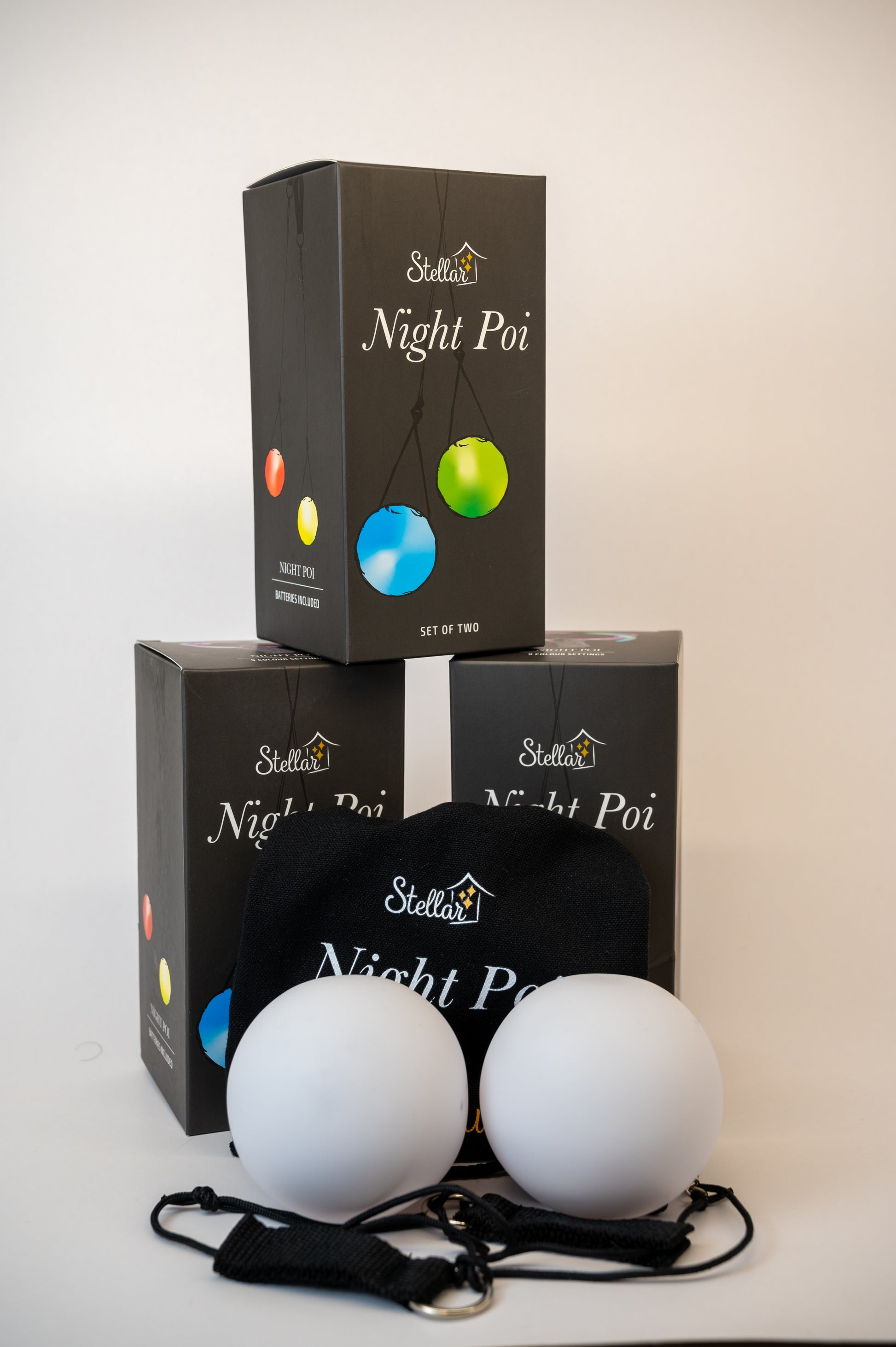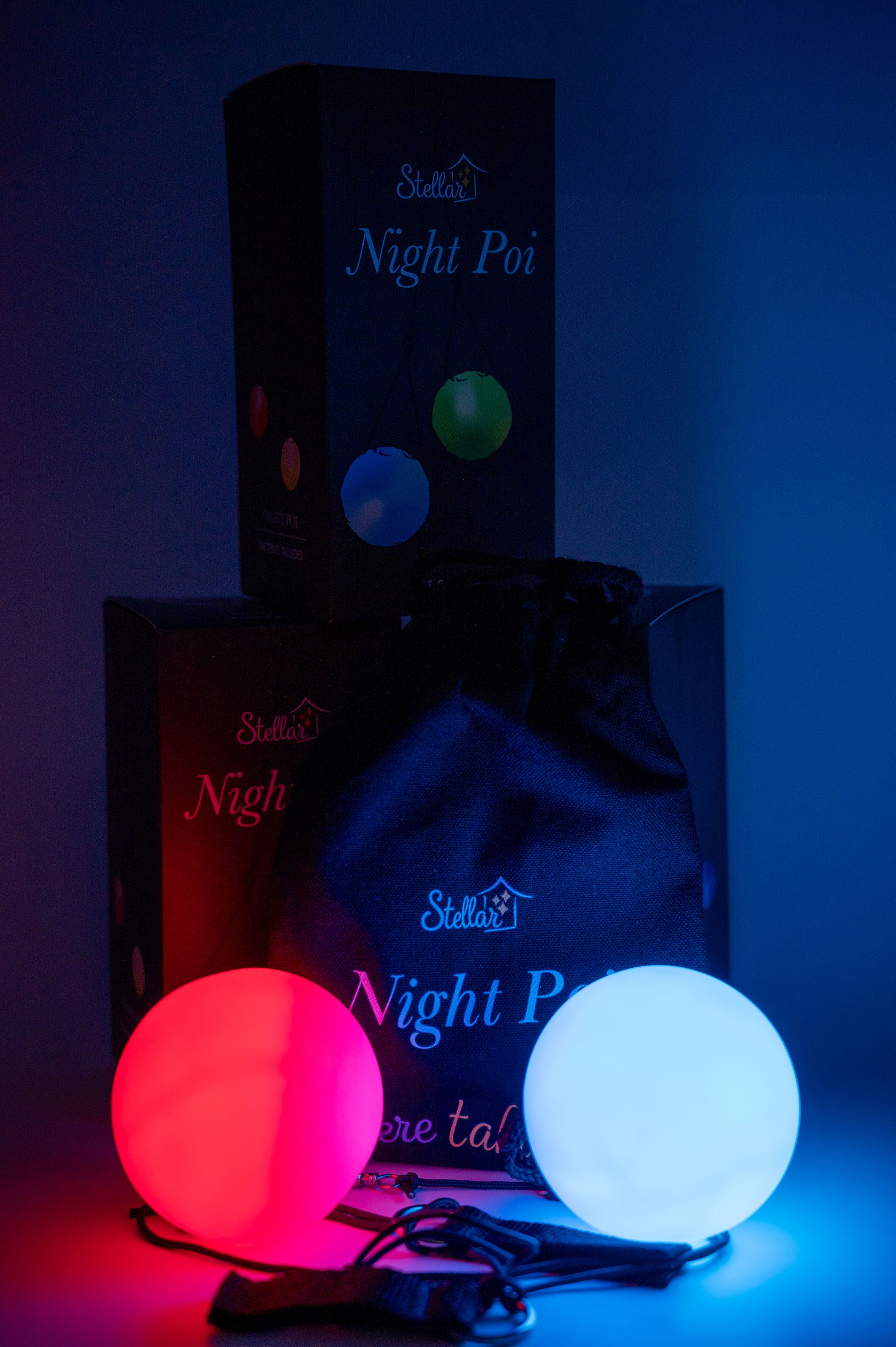 - Set includes two mid/long LED poi with handles, straps and carry bag